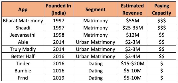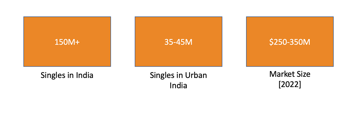 Given the size of the population, Indian dating and matchmaking market seems very attractive! With over 35-45M singles in urban India, it is one of the largest markets in dating [in terms of users]. But the revenue of dating and matchmaking apps has been in the range of $250-350M, much lower than the western markets.