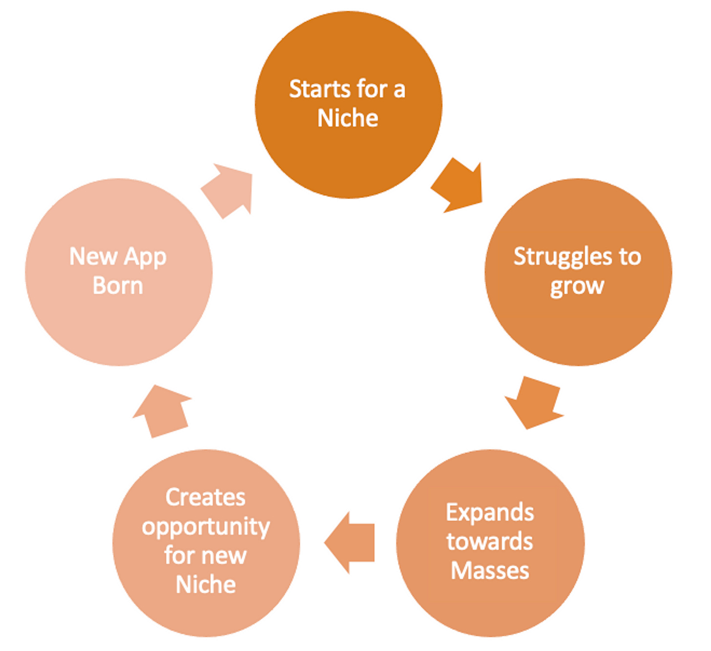 As Tinder became a mass-app, it created opportunity for apps like Hinge, with positioning around serious relationships [new niche]