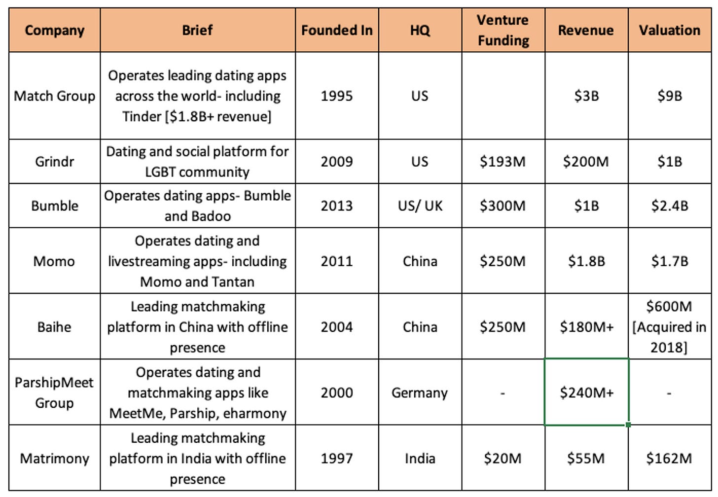 Even though Indian weddings are known to be extravagant- all over the world, but the largest matchmaking platform in India is a matrimony platform- worth $162M with $55M in revenue [Bharat Matrimony]. Dating apps in India haven’t been able to grow as much, some of which can be attributed to the Indian culture. How will this evolve? Going forward, I believe matrimony industry will expand further in the near future as we see more individuals going to the internet to look for potential partners. Dating industry could pick up as well- but I feel that it would take more time since it depends on cultural evolution and systemic shifts in society. Incase one really wants to build a dating app- going global could be the way to solve for market size!