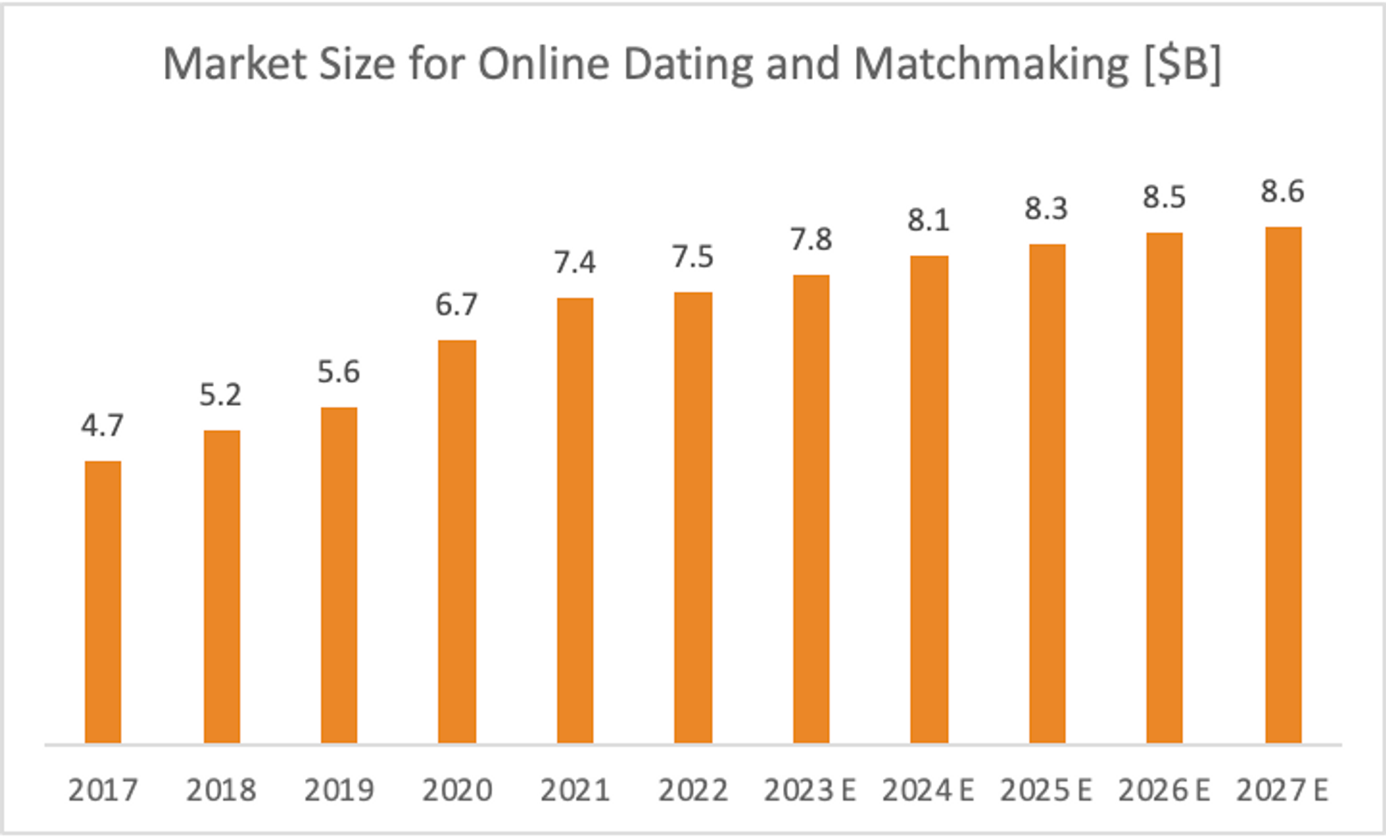 The global market for online dating and matchmaking is expected to be around ~$7.8B in 2023- growing at a slow pace from here on; given that US contributes for more than 30% of the revenue and it’s reaching saturation. The new dating apps will have to displace existing apps in order to become large companies!
