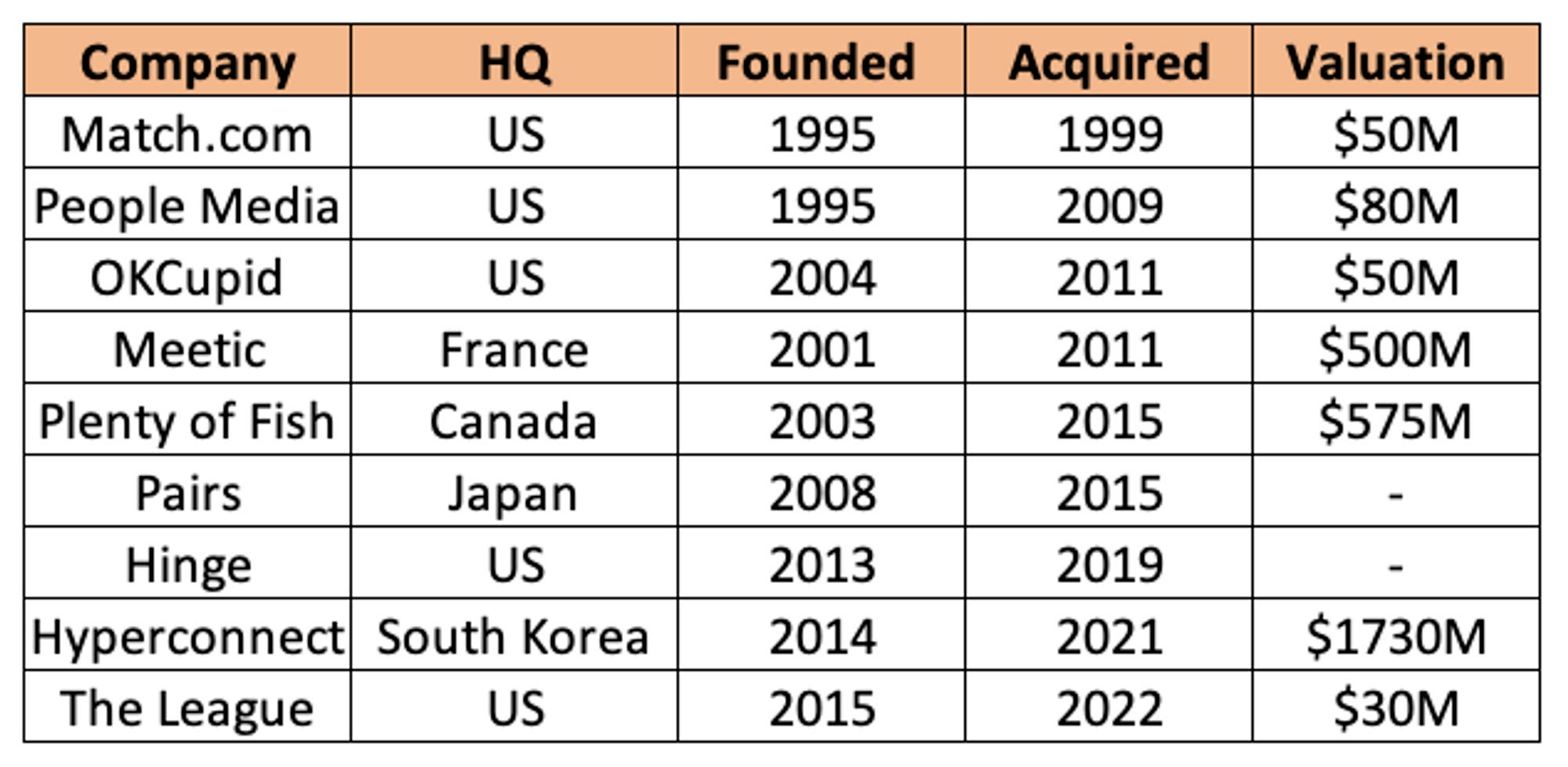 In 1999, Match.com was acquired by IAC- a media conglomerate based in US. In end of 2019, IAC decided to spin off all the online dating brands under Match Group.