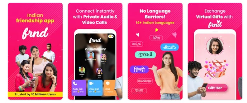 The above mentioned dating apps have largely focused on the Tier 1 cities and English speaking population. Often India is referred to as a country- constituting of many countries; since people across different provinces have different culture and speak different languages. Apps like frnd have focused on the tier 2-3 market in India with regional languages at play and audio first approach. It monetises via micro-payments for chatting with dating experts, to send virtual gifts in audio rooms, etc. Early success of frnd has inspired many startup founders to build ‘dating app for Bharat’.